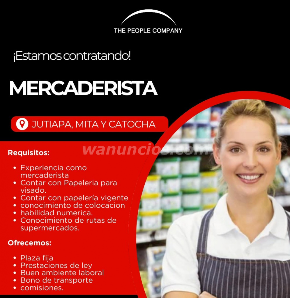 SE ESTA CONTRATANTO MERCADERISTA, PARA EL AREA DE JUTIAPA, ASUNCION MITA, Y COTOCHA, SUELDO BASE DE LEY, MAYOR INFORMACION COMUNICATE AL TEL. 39465670